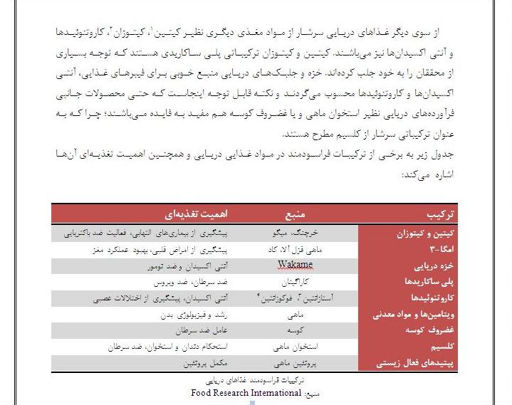 غذاهای دریاییبه دلیل تنوع شگفت انگیز در اجزای تشکیل دهنده و همچنین ارزش تغذیه­ای بالای خود قادرند بخش اعظمی از نیازهای تغذیه­ای بدن انسان را تامین نمایند. در حقیقت می­توان گفت علاوه بر داشتن مزایای فراوان، غذاهای دریایی به دلیل دارا بودن ترکیبات فراسودمند قادر هستند نقش عمده­ای در صنایع غذایی ایفا کنند. پاستا و فرآورده­های نانوایی به جهت مصرف گسترده­ای که در سراسر دنیا دارند، می­توانند یکی از بهترین منابع برای اضافه نمودن این ترکیبات فراسودمند باشند.